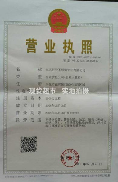 企業(yè)名稱 | 江蘇巨登不銹鋼管業(yè)有限公司 | 統(tǒng)一社會信用代碼 | 321281000070665 |